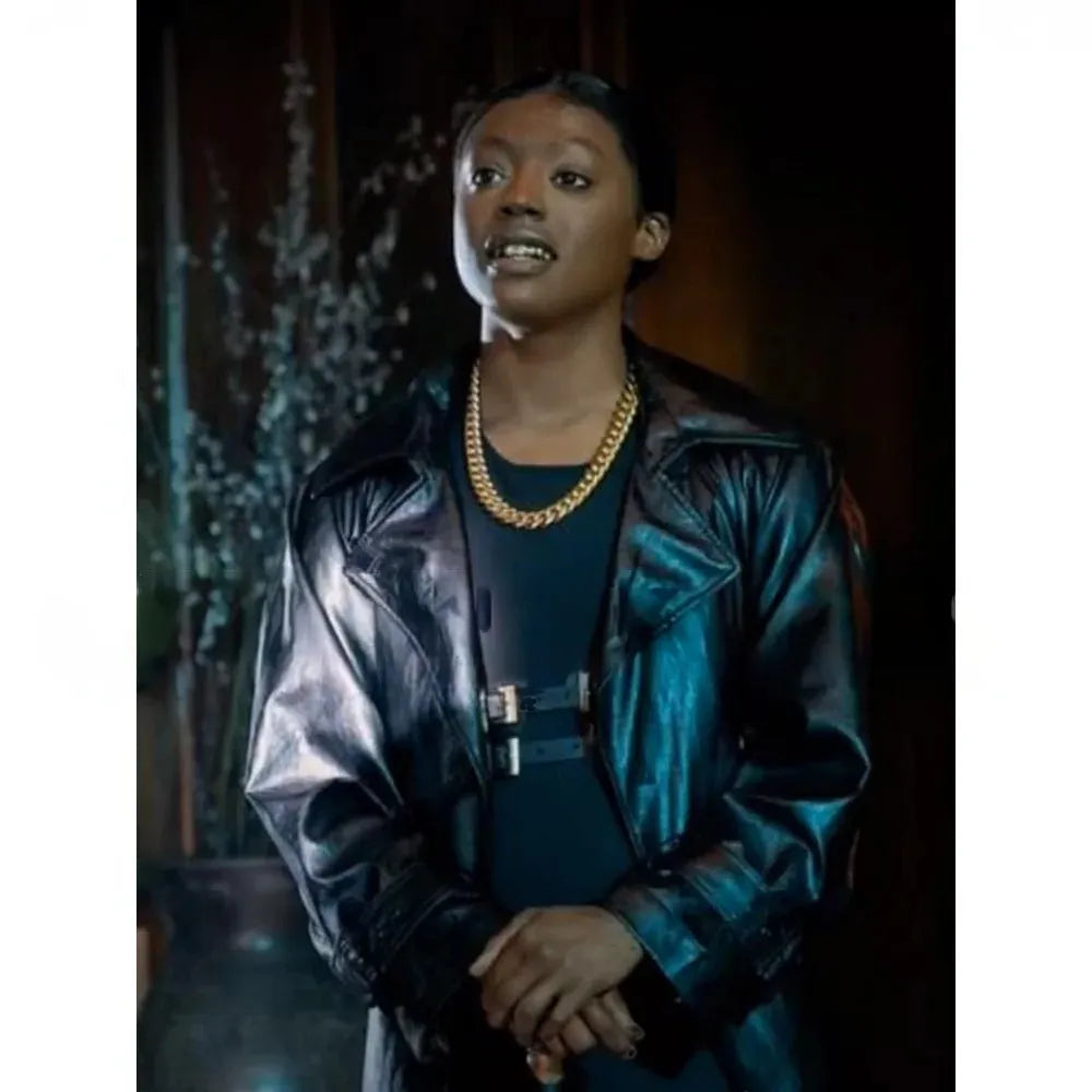 The Laila Pruitt Black Leather Coat is a fashionable and sophisticated piece inspired by the character Nicole portrayed by Laila Pruitt in the "Black Mafia Family" series. This coat exudes elegance and style, making it an essential addition to any fashionable wardrobe.