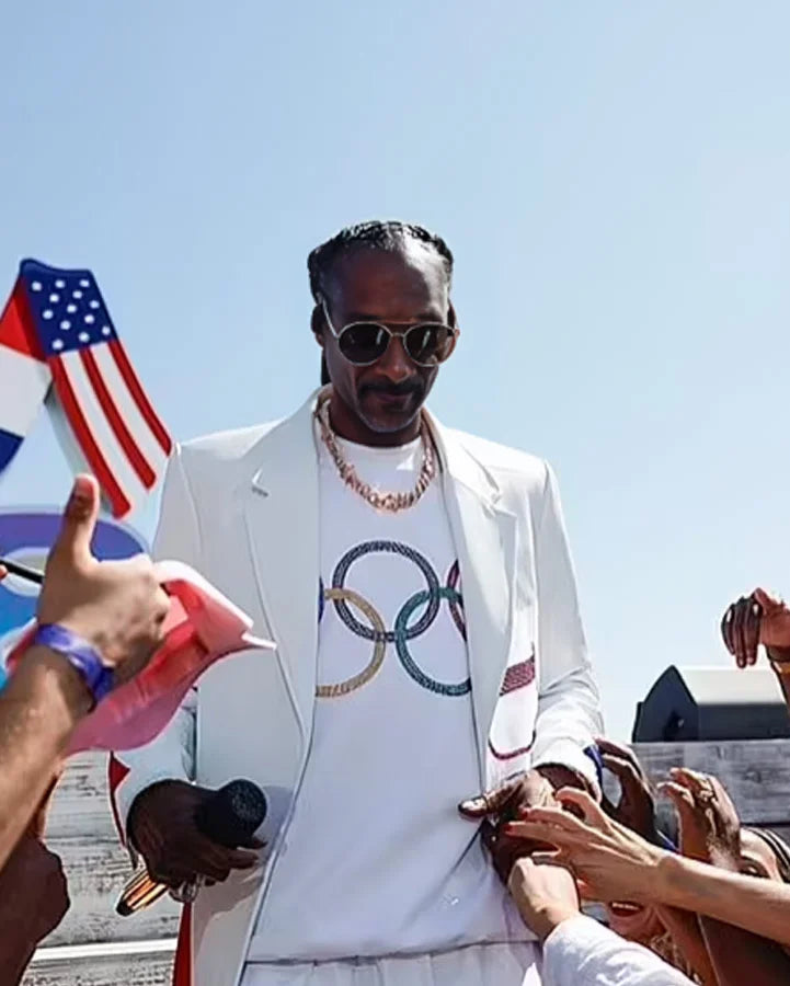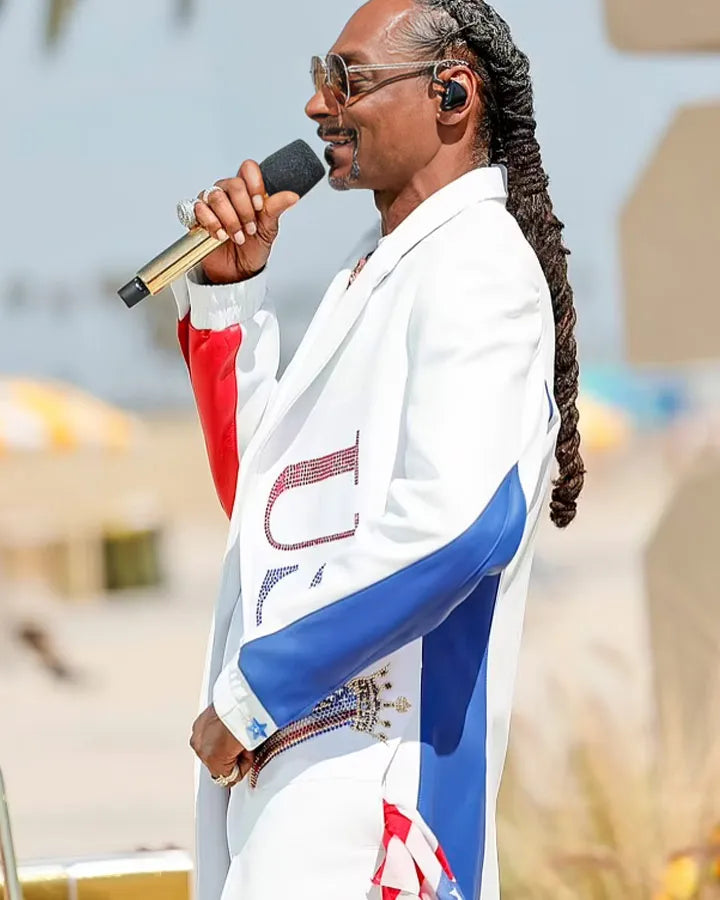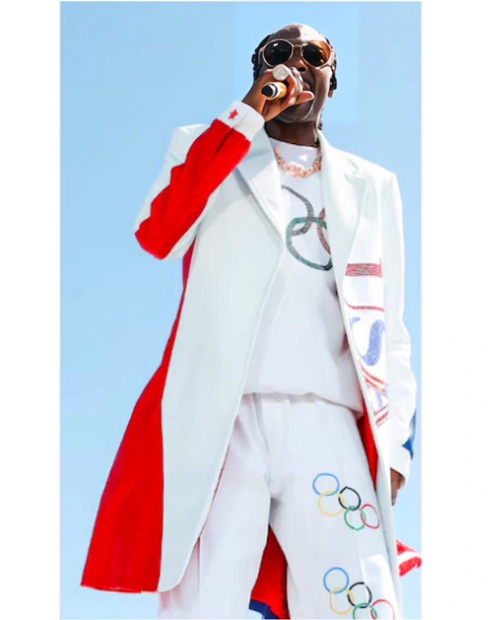 Capturing the spirit of the Paris Olympics, the Snoop Dogg Coat showcases a bold white, red, and blue design. This vibrant mix honors the event and reflects American pride, making it ideal for the closing ceremony or formal occasions.