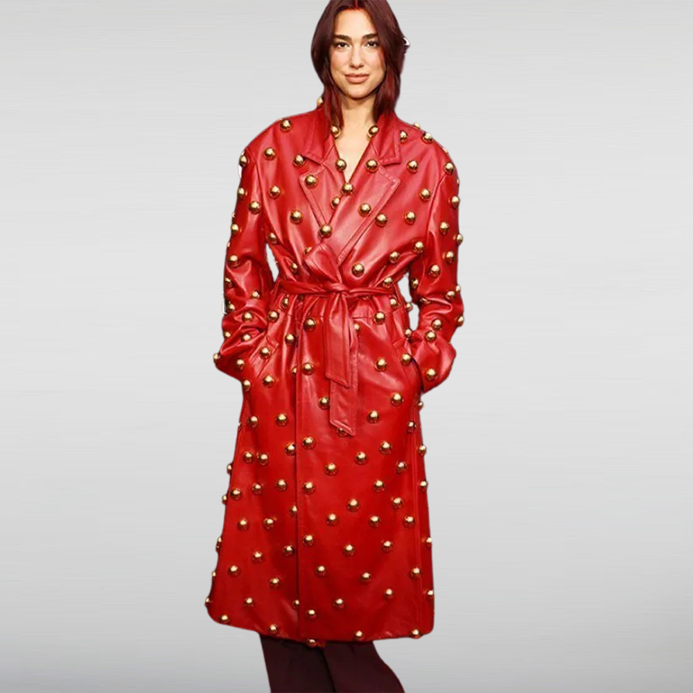 The trendy Dua Lipa Red Leather Coat features a notch lapel style collar and a belt closure. Adding a stylish and elegant touch to the overall design. The stylish appearance of the coat is accentuated by the long sleeves featuring rounded cuffs. With two outer pockets and one inner pocket, this jacket provides ample space for your essentials without compromising on its fashionable silhouette.