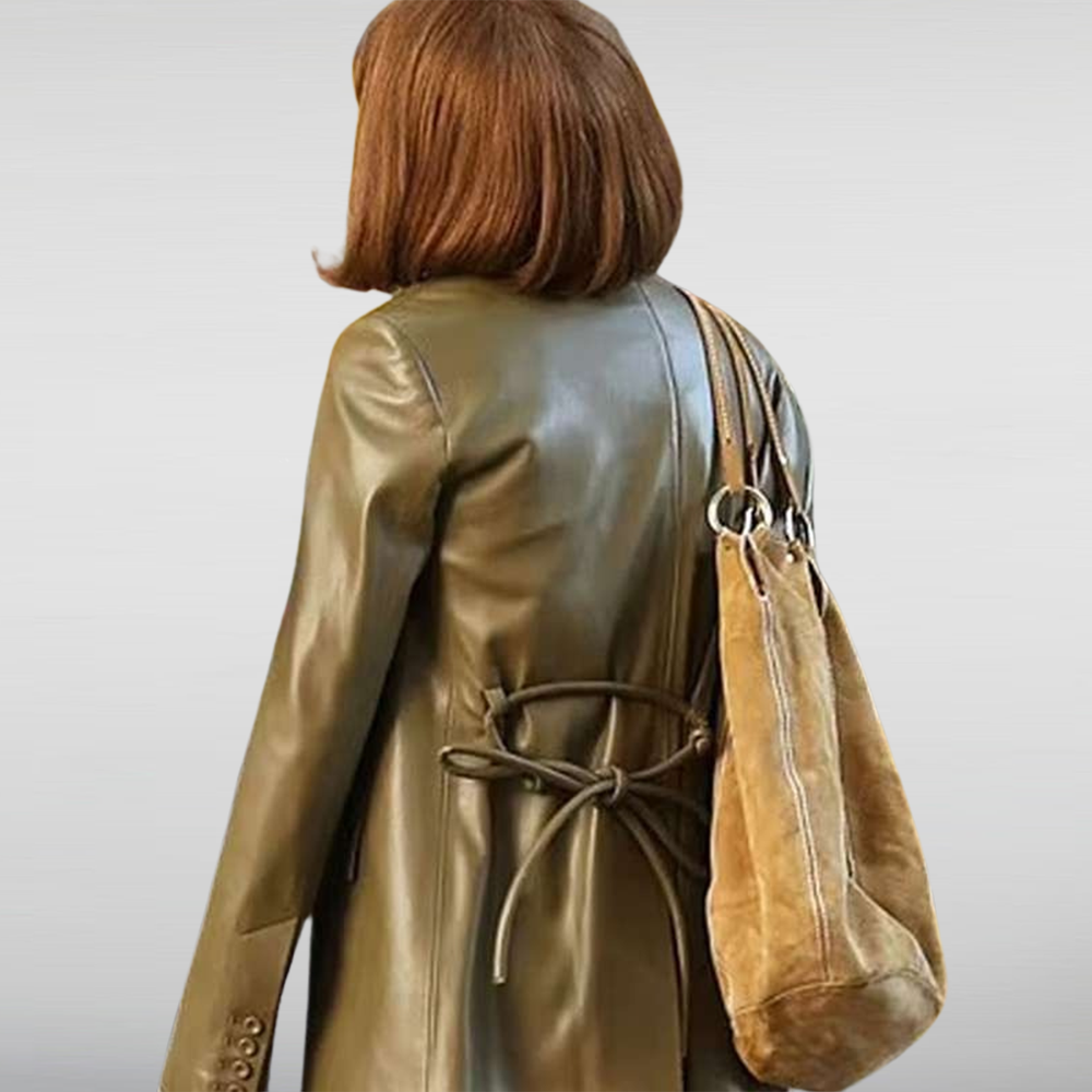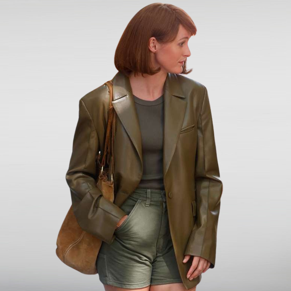 Perfect for any occasion, Renate Reinsve's Olive Leather Blazer seamlessly merges style and practicality. The ample protection offered by the long sleeves is complemented by the convenient storage options provided by the multiple pockets.