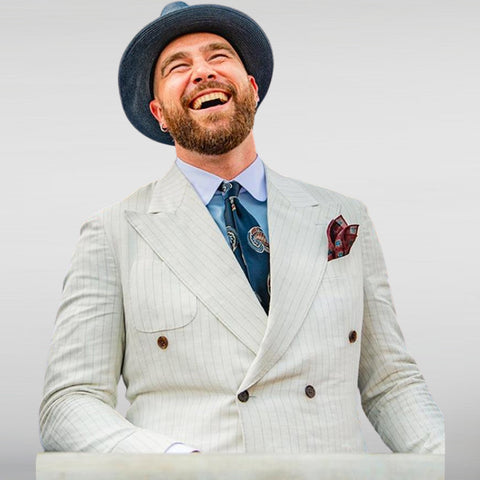 Perfect for admirers of Travis Kelce and individuals who have a taste for sophisticated style, this white pinstripe suit is essential. The contemporary yet timeless white pinstripe design can easily set you apart from others. If you're going to a fancy event or wanting to upgrade your formal wardrobe, this suit is the ideal option.